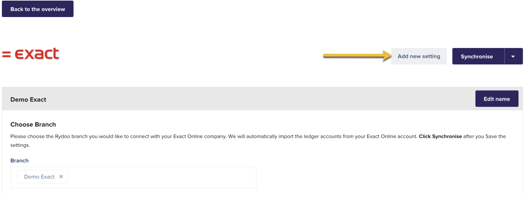 To link different branches to the same Exact Online account, use the 'Add new setting' option.