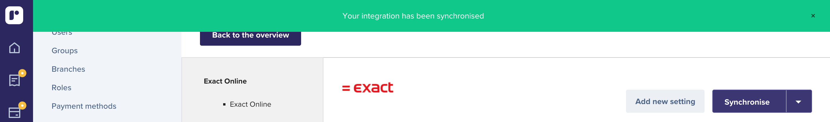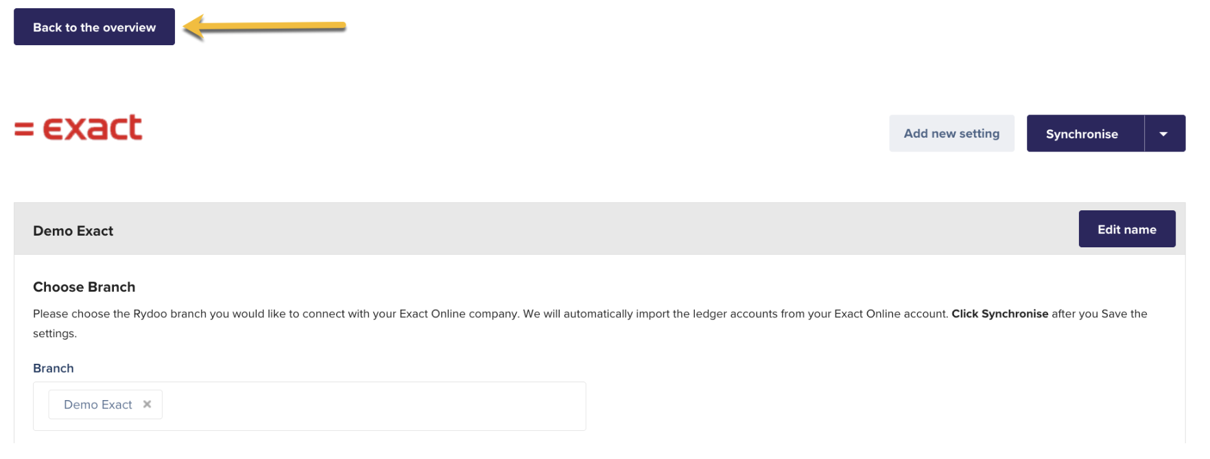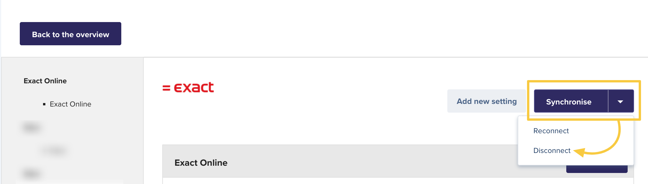 IMPORTANT: If there are multiple Branches with different Exact Online accounts. It's required to click on 'Back to the Overview' after the branch is disconnected.