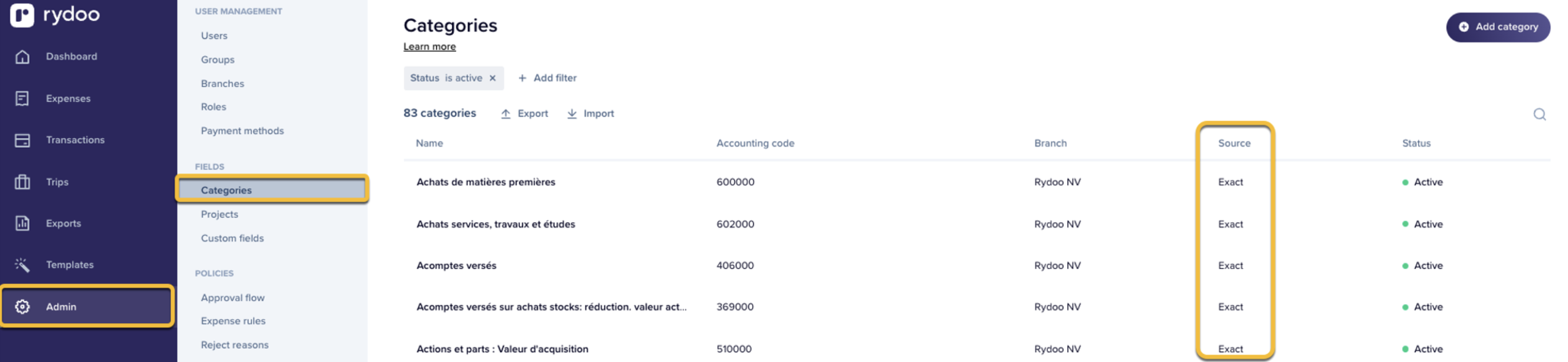The chart of accounts is automatically imported and will be visible under the 'Categories' section in Rydoo.
