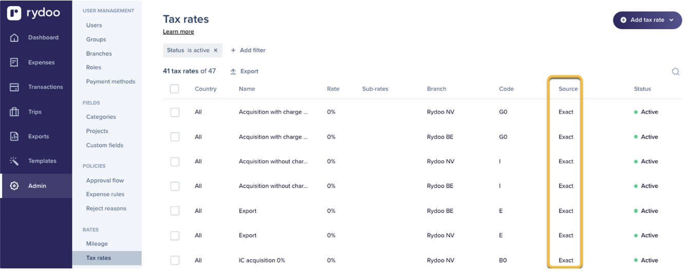 Expenses with tax rates created in Rydoo will fail to export to Exact Online. -