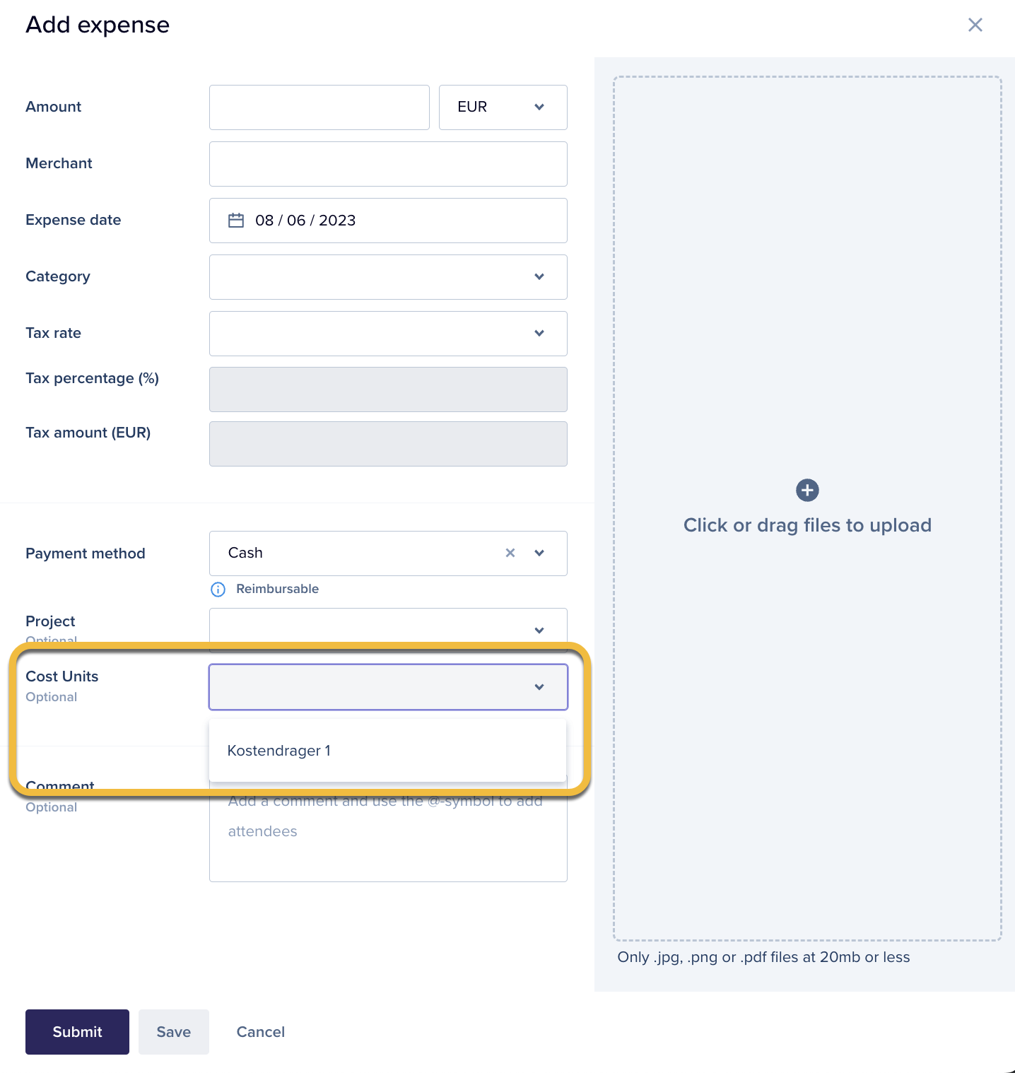 - Bank Account (optional): even though it says 'optional', this field becomes required for successfully syncing expenses to Exact Online. Please link it to a bank account that has been imported from Exact Online.