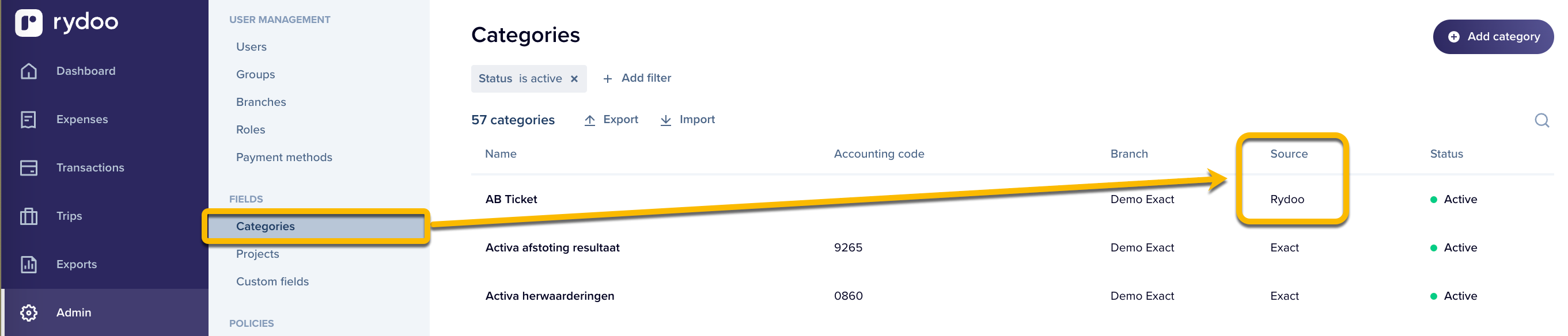 - If there aren't past expenses (reported status), you can easily delete the categories with the Rydoo source.