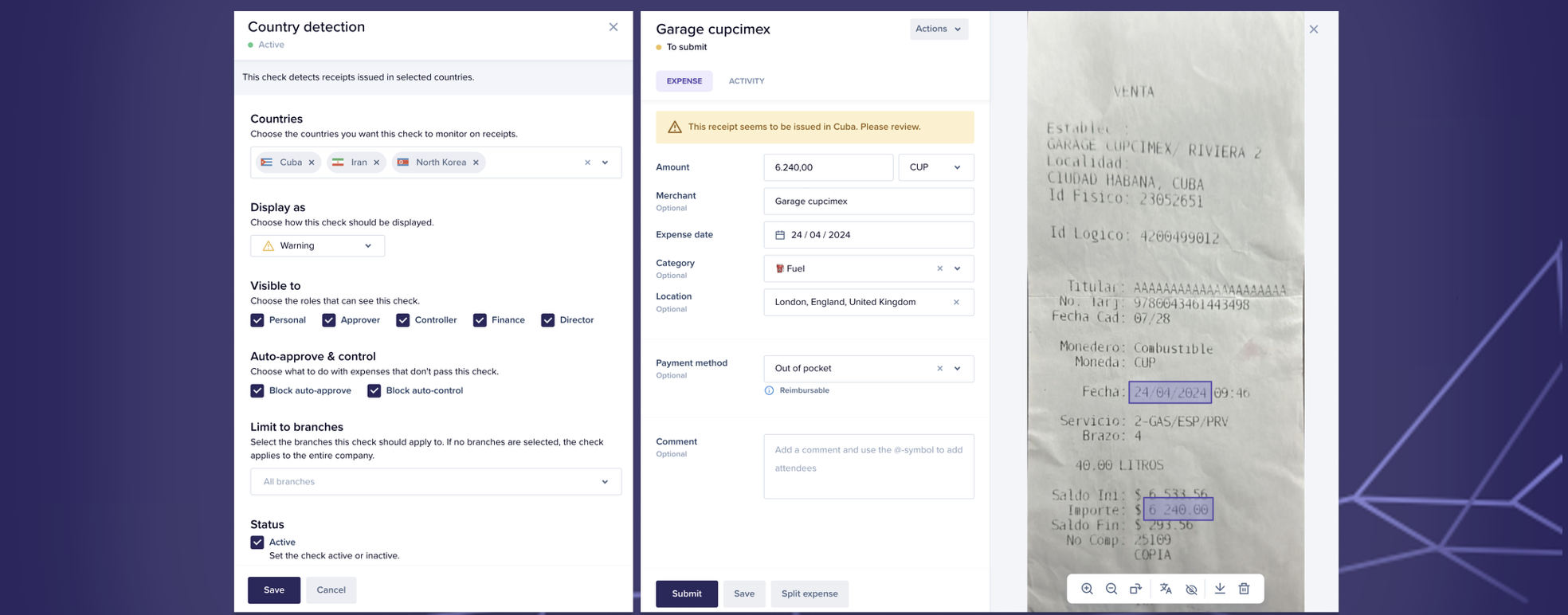 - Country detection: Detects receipts issued in restricted or sanctioned countries based on company policy.