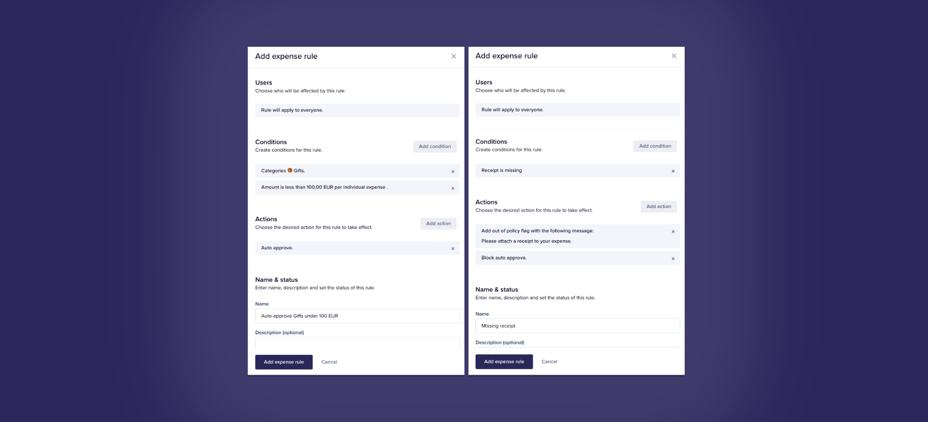 - Rejected expense: Blocks auto-approval or control of previously rejected expenses.