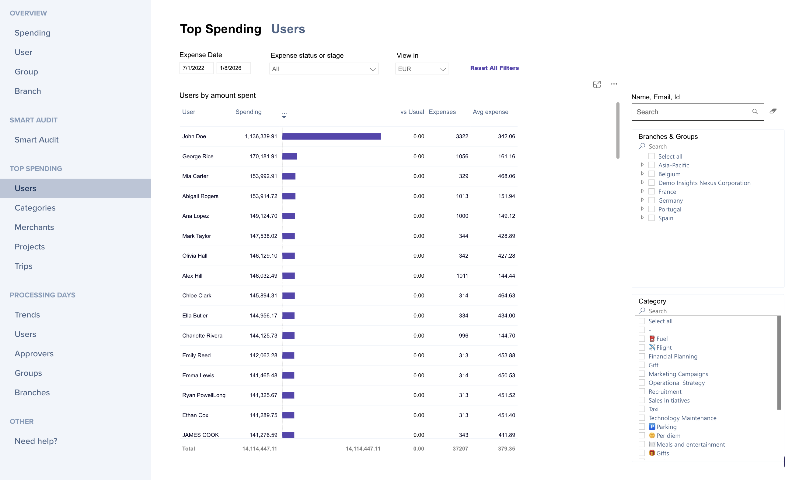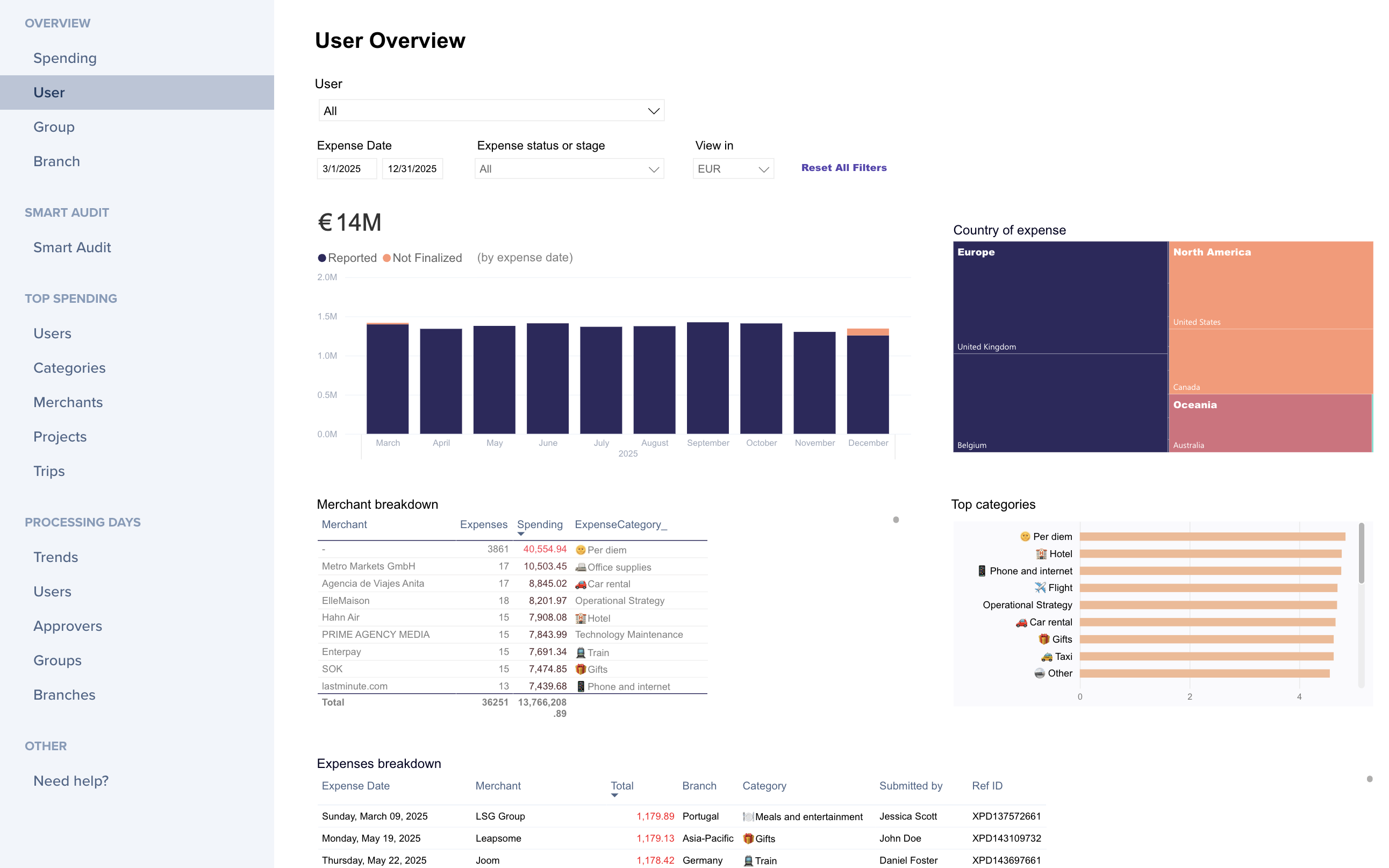The top spending dashboards give you insight into the users, categories, merchants, projects and trips with the highest spend.