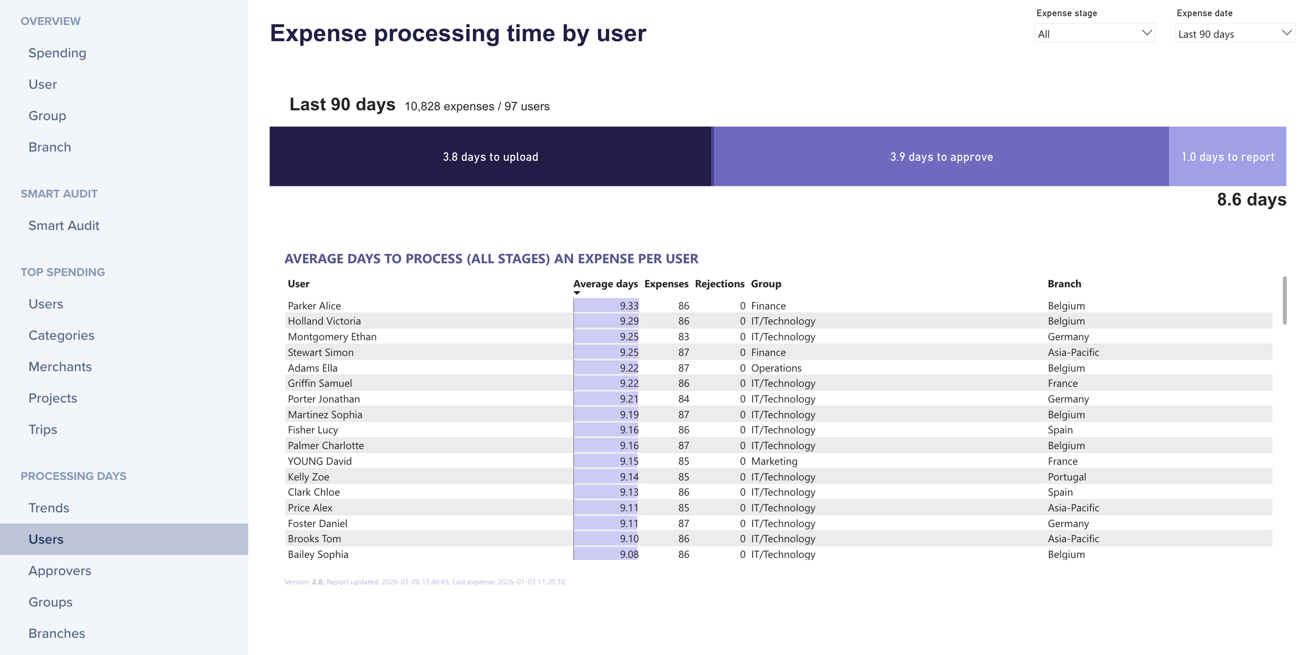 With this dashboard you can track the processing time for each expense stage, grouped by the month in which the expense occurred.